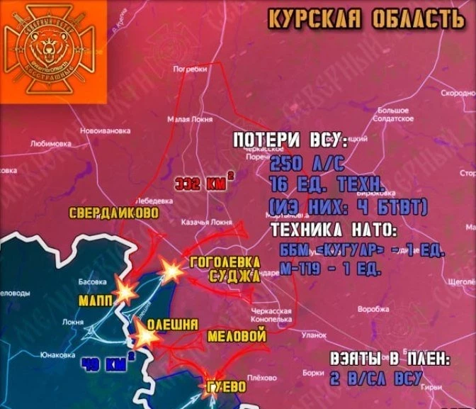 Враг пытается удержаться за несколько квадратных километров Суджанского приграничья, перебрасывая недавно мобилизованных десантников (80 одшбр) и штурмовиков 41-й механизированной бригады в окрестности МАПП "Суджа" и хутора Олешня - личный состав противника перемалывается Северянами.