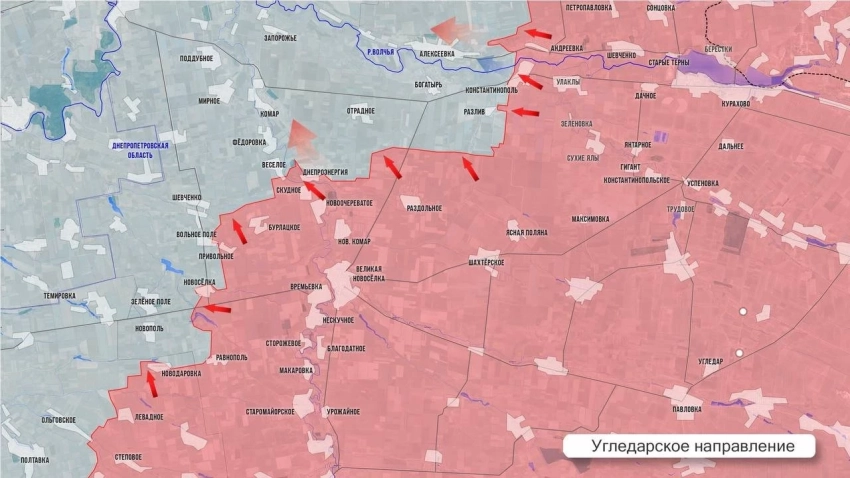 На Угледарском фронте успехи ВС РФ есть сразу в нескольких локациях. В районе Новосёлки наши военные забрали 3 лесополосы и продвинулись примерно на 1 км, сообщают, что есть продвижение и в Вольном Поле. В районе Бурлацкого продвинулись почти на 1 км на север, в Весёлом очень ожесточённые бои. В районе Константинополя противник постоянно контратакует, наши держатся. Южнее Разлива ВС РФ сумели продвинуться по обе стороны от дороги Великая Новосёлка - Богатырь и прорвать на ней цепь «зубов дракона» ВСУ. На северном берегу Волчьей с нашей стороны продолжается штурм Алексеевки.