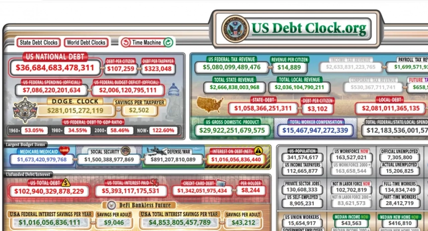 Суммарный долг США при этом продолжает активно расти, ничуть не снизив своей скорости. На текущий момент его объёмы составляют почти 36,7 трлн долларов.