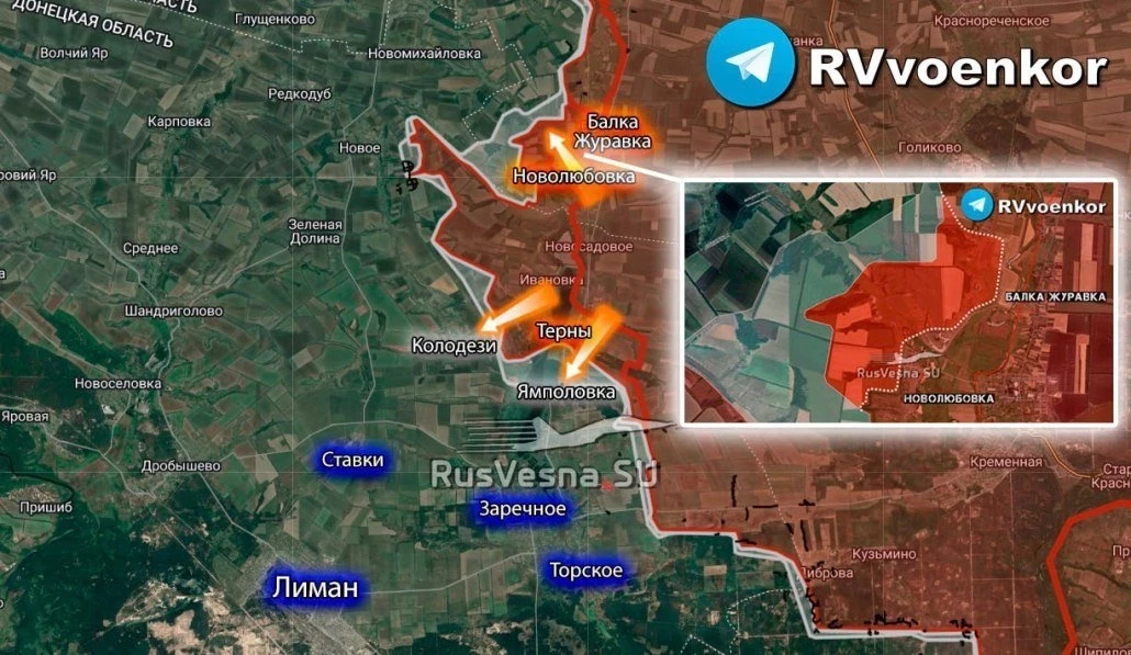 На Краснолиманском участке ВС РФ продвигаются районе Колодезей. Наши стремятся к рубежу Шандриголово-Новосёловка-Дробышево, который наши военные долгое время обороняли осенью 2022. В направлении Зелёной Долины ВС РФ расширили контроль на 300 м. По последним данным, наши вошли в Новое, что на рокадной трассе снабжения гарнизона врага в Красном Лимане, который является по сути восточным воротами в Славянск.