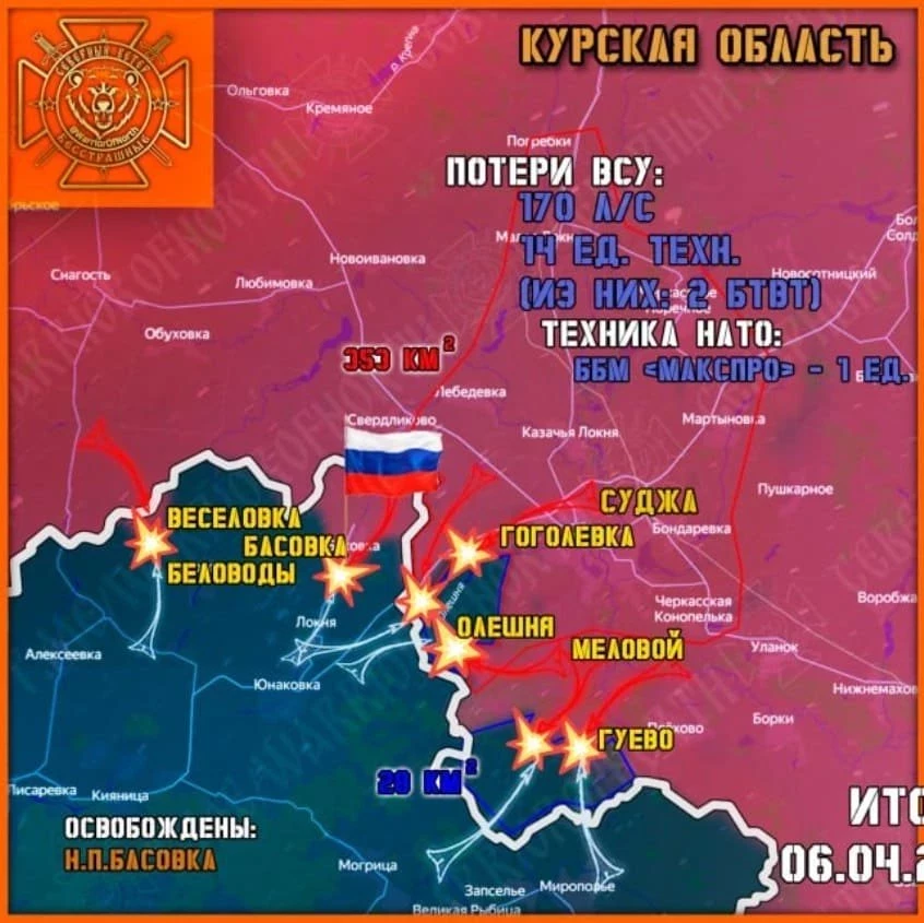 Сообщают о больших потерях противника в селе Водолаги у Владимировки, где в результате атаки наших беспилотников были уничтожены две группы резервов противника и бронетехника. Сегодня Минобороны официально сообщило о взятии под контроль Басовки Сумской области. Также сообщают о зачистке участка между Басовкой и ГИС «Суджа» на глубину 2 км.
