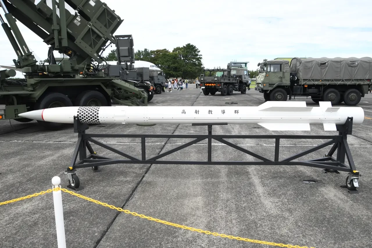 ЗРК «Пэтриот» на позиции на авиабазе Касуга: машина управления, станция наведения ракет с ФАР, пусковая установка с двумя ракетами в контейнерах.