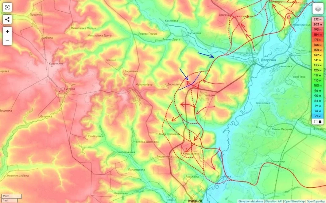 Ранее мы наступали здесь в основном на западном берегу реки Оскол. Но в последние дни уперлись в упорную оборону противником линии Малая Шапковка - Кондрашевка.