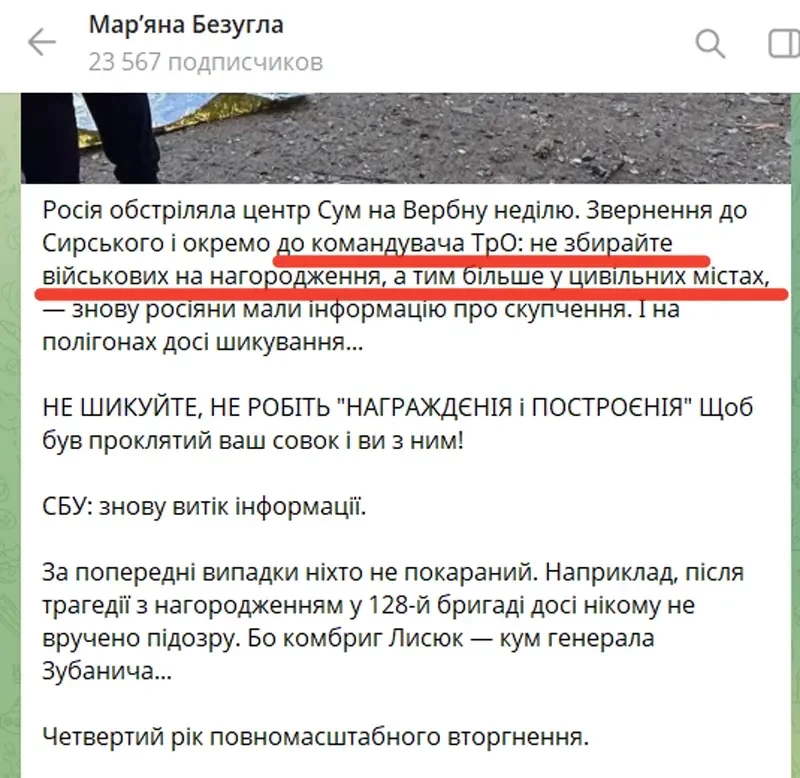 Обращение к Сырскому и отдельно к командующему ТрО: не собирайте военных на награждение, а тем более в гражданских городах — опять россияне располагали информацией о скоплении. И на полигонах до сих пор построение...
