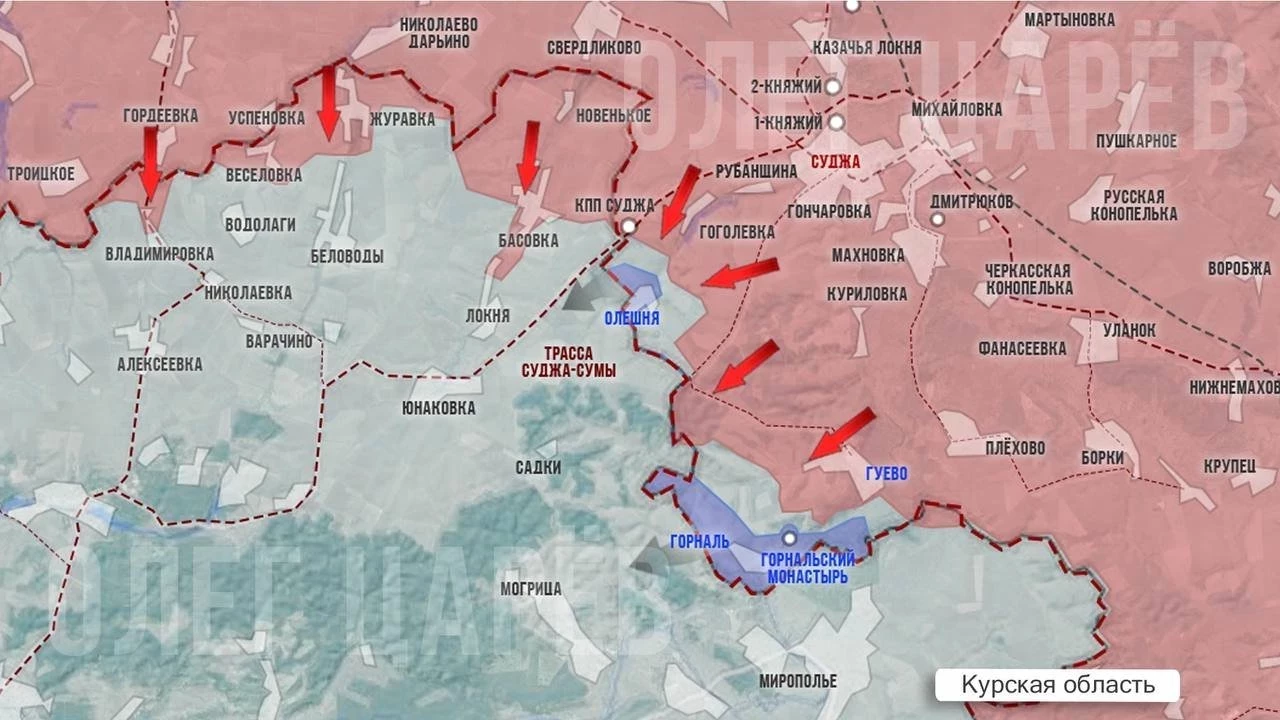 Таким образом в Курской области у противника теперь нет единой зоны оккупации. Наши войска отрезали подразделения, засевшие в монастыре и у горы Фагор в районе упомянутого населённого пункта Горналь от Олешни. Теперь транспортной коммуникации у врага между этими населёнными пунктами фактически нет. Чтобы коммуницировать, необходимо использовать территорию сумского приграничья, но и там всё «не просто» для ВСУ ввиду наступательных действий армии России и активности российской авиации.