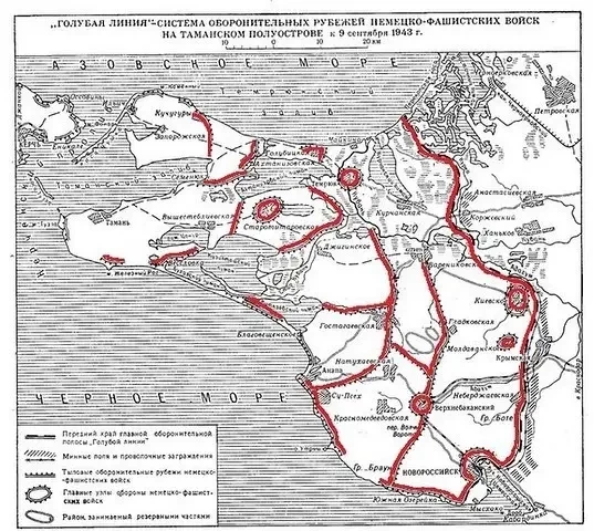 В «Голубую линию» входили «Венская» (между Ахтанизовским и Кизилташским лиманами), «Предберлинские позиции» (между Ахтанизовским лиманом и Таманским заливом), «Берлинская линия обороны» (на 5 км севернее – между станицей Ахтанизовская и Таманским заливом).