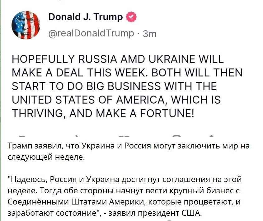 «Надеюсь, Москва и Киев достигнут соглашения на этой неделе. Тогда обе стороны начнут вести крупный бизнес с нами», - написал американский президент в соцсетях.