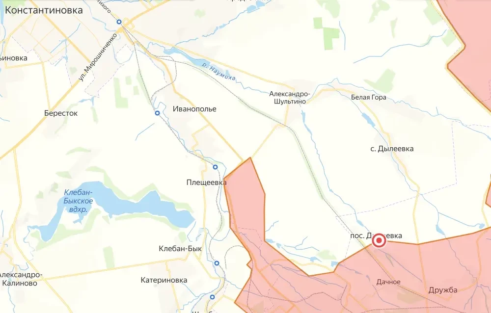 Одноимённое село (Дылеевка) расположено севернее посёлка, менее чем в 10 км от Константиновки, к которой приближаются наши войска с нескольких направлений.