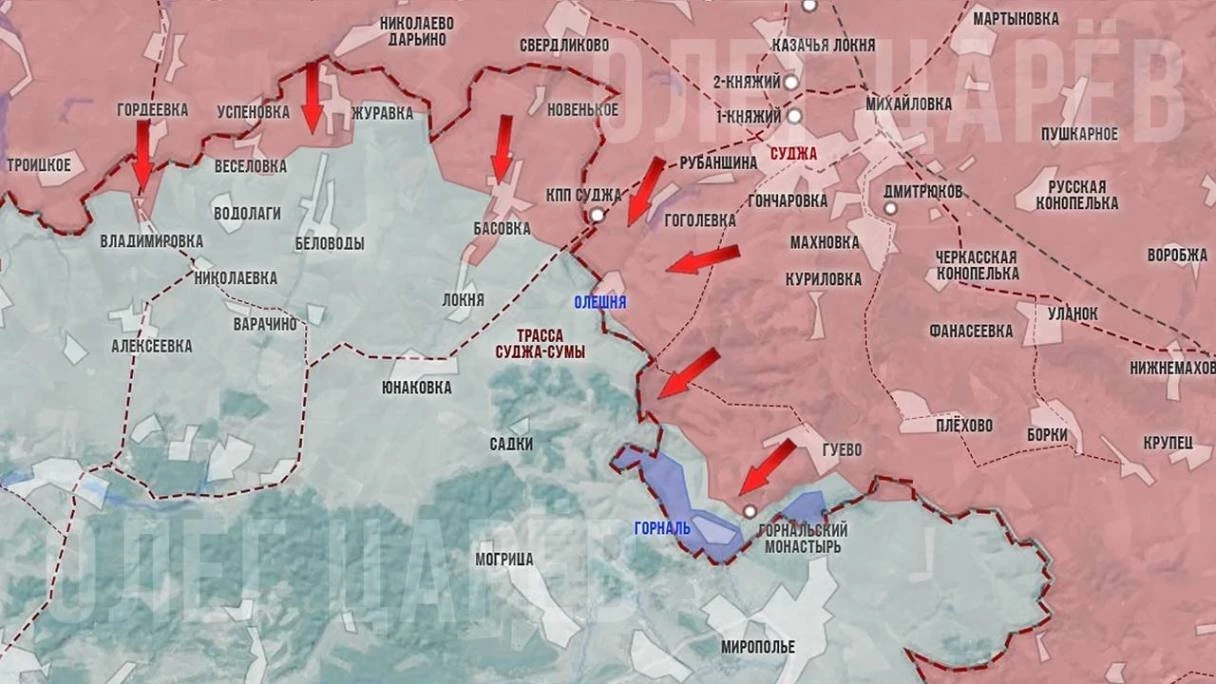 Российские войска ведут бои в лесных массивах между Олешней и Горналью под плотным огнём противника, стараясь зачистить территорию вдоль границы. Активные боевые действия идут также на подступах к селу Горналь, об изменениях позиций пока известий нет.