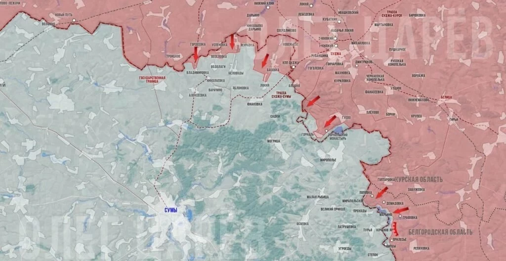 На Сумском направлении ВС России продвигаются у Локни, стремясь выйти к Юнаковке, дорога из которой ведет в Курскую область, сообщают о штурмовых действиях армии РФ в населенном пункте Беловоды, пишет Telegram-канал «Два майора».
