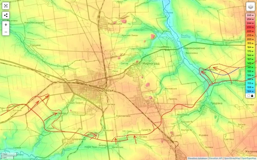 Южнее тоже наши войска продолжают атакующее действие между агломерациями Торецка и Покровска. Идут бои на постах Новой Полтавки, Романовке и к Александрополю. Здесь тоже полностью инициатива у нас.