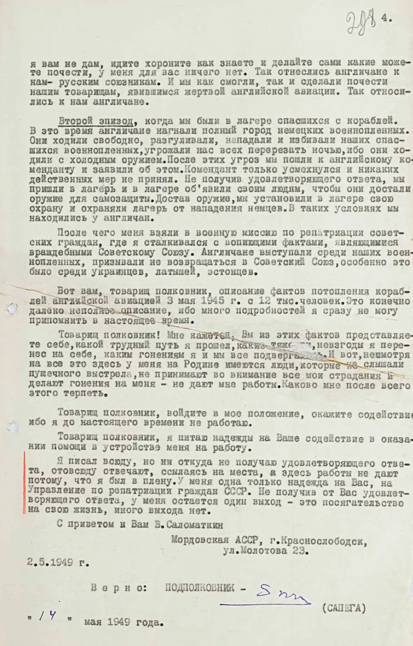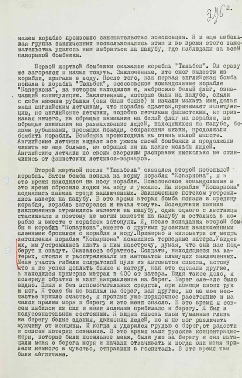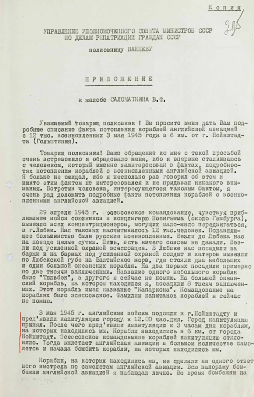 3 мая 1945 г. английские войска подошли к г. Нойштадту и предъявили капитуляцию городу к 12.00 часам дня. Город капитуляцию принял. После чего предъявили капитуляцию к 3 часам дня кораблям, на которых находились мы. Корабли находились в 6 км от города Нойштадт. Эсэсовское командование кораблей капитуляцию отклонило. Тогда вылетает английская авиация в большом количестве самолетов и начала бомбить корабли, на которых находились мы. Корабли, на которых находились мы, не сделали ни одного ответного выстрела по самолетам английской авиации. Всю панораму бомбежки английской авиации я наблюдал лично. Во время бомбежки на нашем корабле произошло замешательство эсэсовцев. Я и еще небольшая группа заключенных воспользовалась этим, и во время этого замешательства удалось нам выбраться на палубу, где наблюдали за всей панорамой бомбежки.