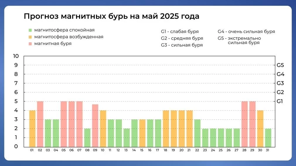 С начала 2025 года специалисты Лаборатории солнечной астрономии зафиксировали резкий рост числа магнитных бурь. По их данным, за четыре месяца текущего года произошло уже 21 геомагнитное возмущение, что в 2,5 раза превышает аналогичный показатель за тот же период 2024 года, когда их было всего восемь.