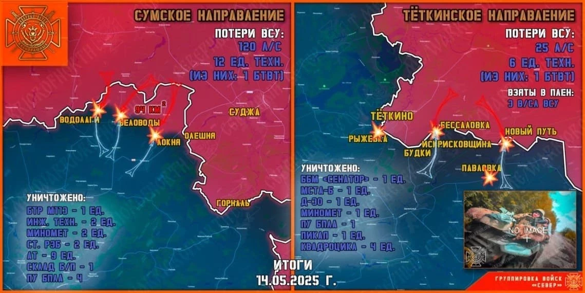 В окрестностях Тёткино завершается уничтожение разрозненных групп ВСУ; организована и ведется непрерывная воздушная разведка в целях предотвращения очередных попыток украинской стороны прорваться на российскую территорию, отметил «Северный ветер».