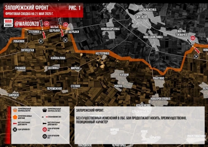 На Запорожском фронте по-прежнему идут позиционные бои в районе Новоданиловки, Малой Токмачки, Новоандреевки, Щербаков и Каменского.