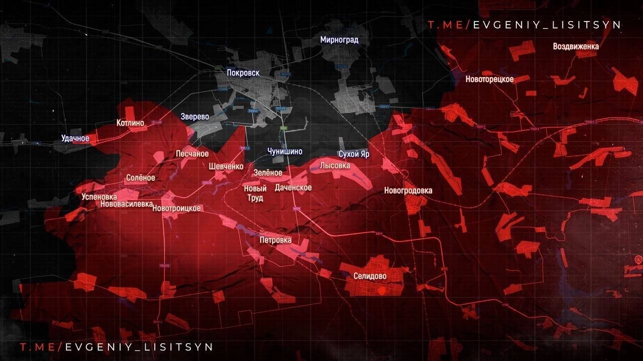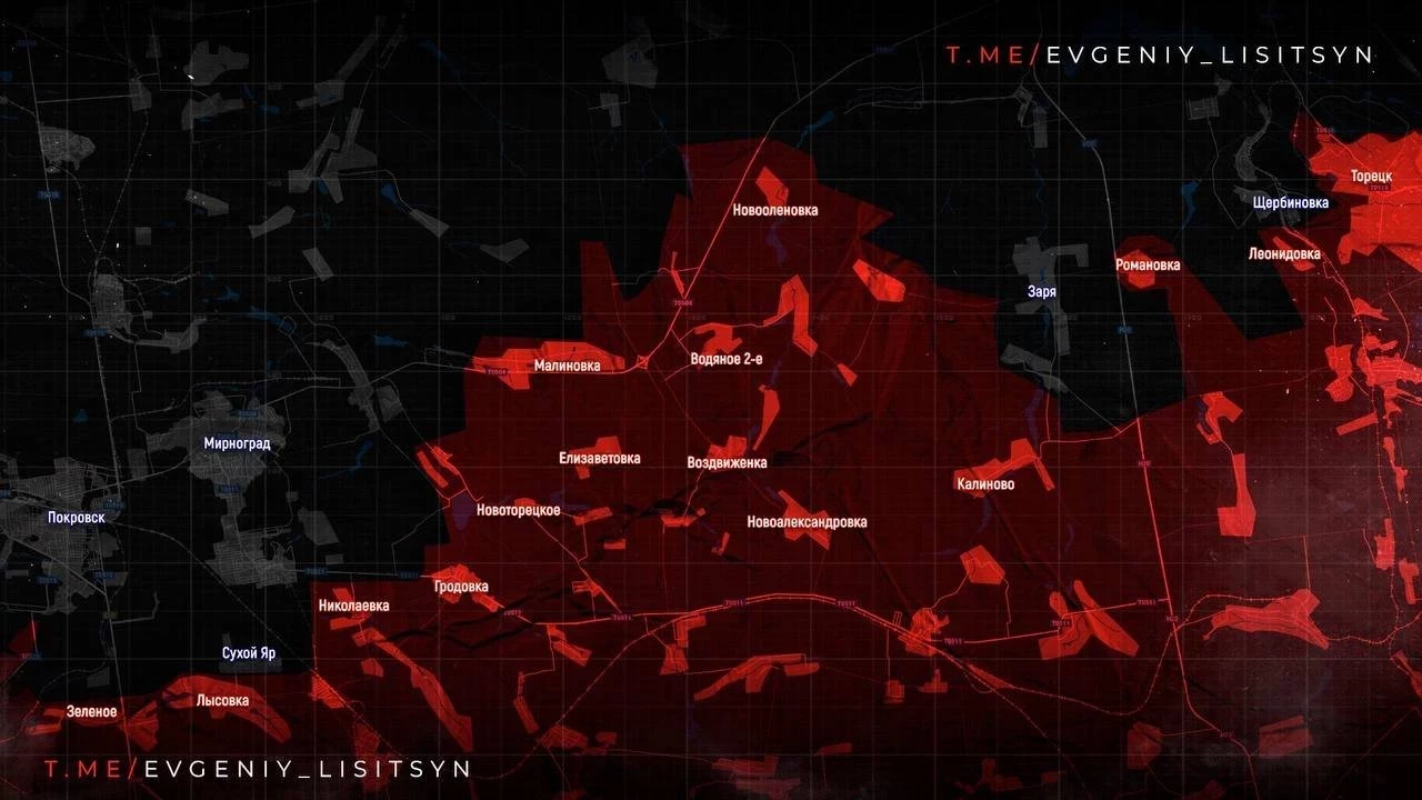 В населённых пунктах Удачное, Котлино и Зверево продолжаются позиционные бои. В Бельгийке российские подразделения восстановили контроль, продвигаясь в направлении Чунишино. На восточном фланге ведётся зачистка территории между Елизаветовкой, Малиновкой и Мирноградом.