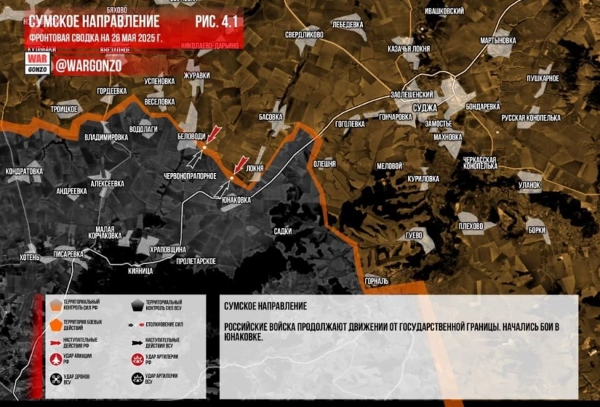 В Сумской области, как пишет Telegram-канал Wargonzo, российские войска продолжают движение от государственной границы. Начались бои в Юнаковке. В районе Тёткино по-прежнему сохраняется напряженная обстановка, российские войска наносят удары по силам и средствам ВСУ, в том числе и в тыловой зоне.