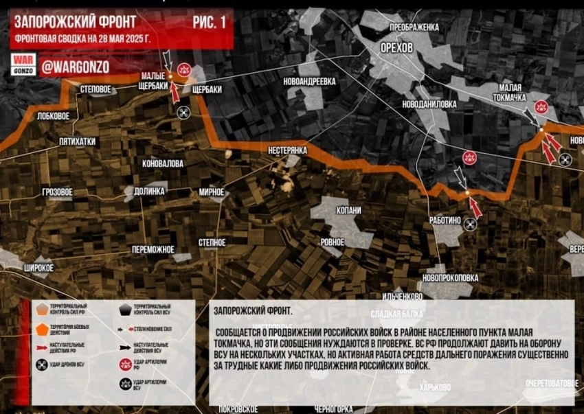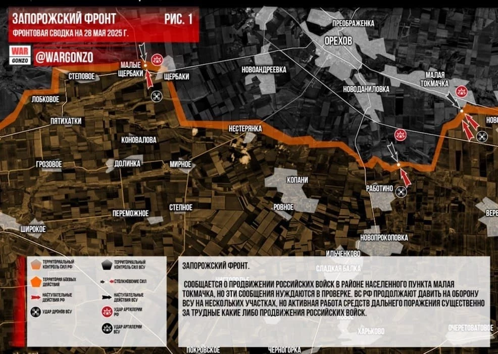 На Запорожском направлении сообщается о продвижении российских войск в районе населенного пункта Малая Токмачка, но эти сообщения нуждаются в проверке. ВС РФ продолжают давить на оборону ВСУ на нескольких участках, но активная работа средств дальнего поражения существенно за трудные какие либо продвижения российских войск.