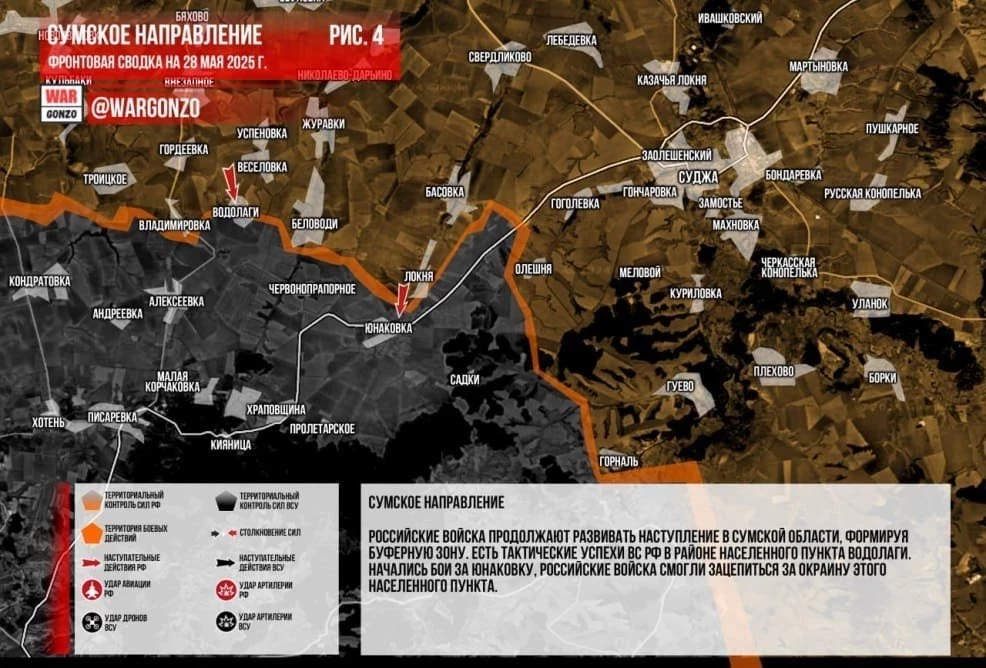 На Сумском направлении противник продолжает предпринимать попытки улучшить свои позиции в приграничье, атакую в районе Тёткино. Все попытки ВСУ продвинуться отбиты, личный состав уничтожен, часть сил отступила на исходные позиции. Российские войска продолжают развивать наступление в Сумской области, формируя буферную зону. Есть тактические успехи ВС РФ в районе населенного пункта Водолаги. Начались бои за Юнаковку, российские войска смогли зацепиться за окраину этого населенного пункта.