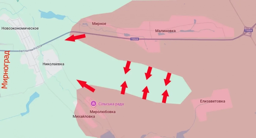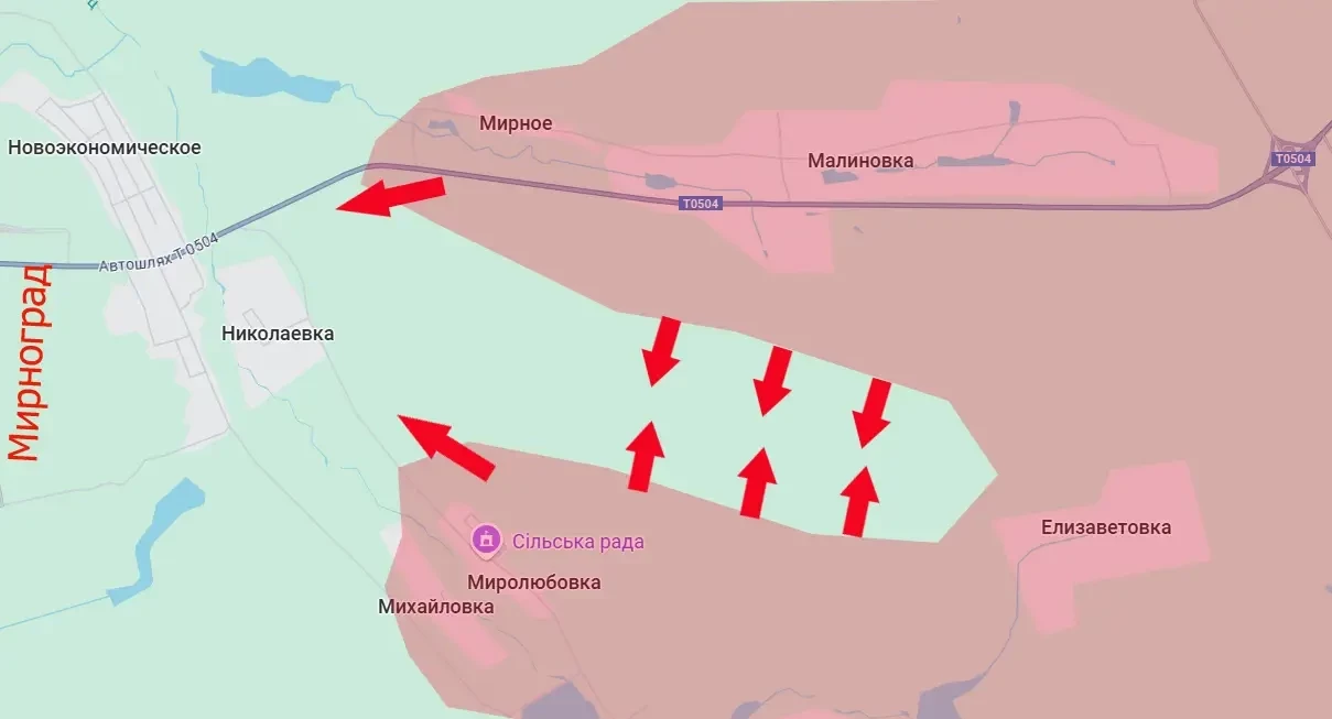 Дело в том, что после освобождения Малиновки, Миролюбовки и села Мирное к востоку от Мирнограда сформировался огневой мешок для ВСУ. Это территориальная полоса от северных предместий Елизаветовки до упомянутого Мирного. Узость полосы позволяет простреливать любые позиции, находящиеся там.