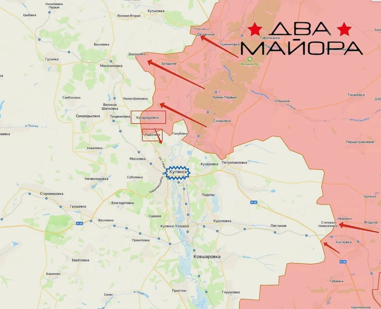 На Купянском направлении Вооружённые силы Российской Федерации (ВС РФ) ведут бои в районе Рядковки и Голубовки, ВС РФ вплотную подошли к северным окраинам Купянска.