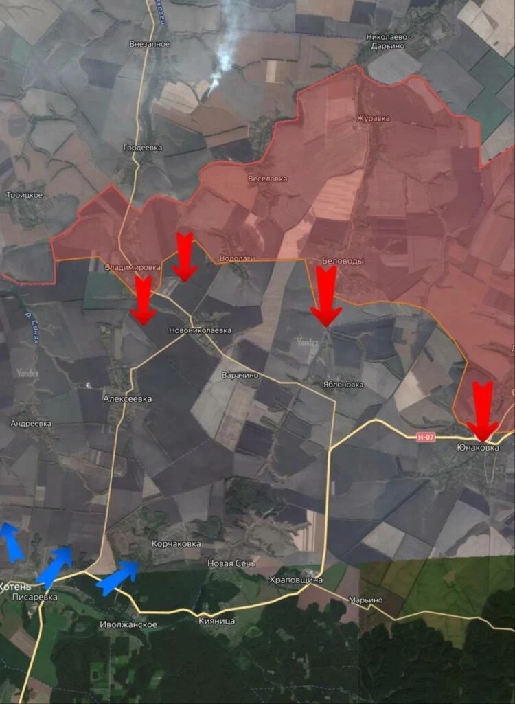 На Сумском направлении освобождены Водолаги и Алексеевка, бои в центре Юнаковки. ВС РФ формируют плацдарм для выхода на Сумы, до города около 30 км. Противник эвакуирует население из 11 сёл. Зафиксировано продвижение наших со стороны Плехово, сообщает военкор Евгений Лисицын в своём Telegram-канале.