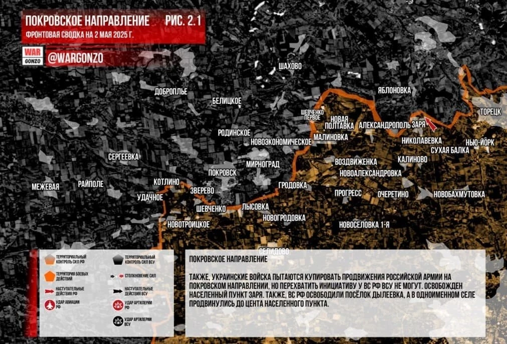 Также, украинские войска пытаются купировать продвижения российской армии на Покровском направлении, но перехватить инициативу у ВС РФ ВСУ не могут. Освобождён населённый пункт Заря. Кроме того, ВС РФ освободили посёлок Дылеевка, а в одноименном селе продвинулись до цента населённого пункта, сообщает Telegram-канал Wargonzo.