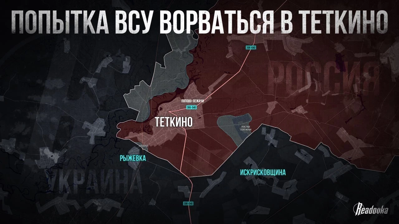 На Сумском направлении противник не бросает попыток закрепиться в Тёткино Курской области. ВСУ ведут атаку сразу по нескольким направлениям, пытаясь максимально сковать в маневре наши силы прикрытия границы. В частности, украинцы атакуют со стороны сёл Рыжевка и Искрисковщина. Задача неприятеля очевидна - отрезать наш гарнизон в Тёткино от сообщения с тылом по трассе 38К-040. При этом украинские штурмовые группы сумели закрепиться у приграничных водоочистных сооружений в 3 км к юго-востоку от Теткино. Противник пытается развить успех и заскочить в прилегающее к поселку село Попово-Лежачи - так он, судя по всему, хочет перерезать шоссе 38К-040: это его главная задача, сообщает Telegram-канал Readovka. Кроме того, ВСУ ведут вспомогательные атаки в направлении урочища Монахов Лес в 7 км к востоку от Тёткино и в направлении села Обуховка. Этим противник пытается не дать нашим подразделениям прикрытия границы сконцентрироваться для контрмер в районе Тёткино.