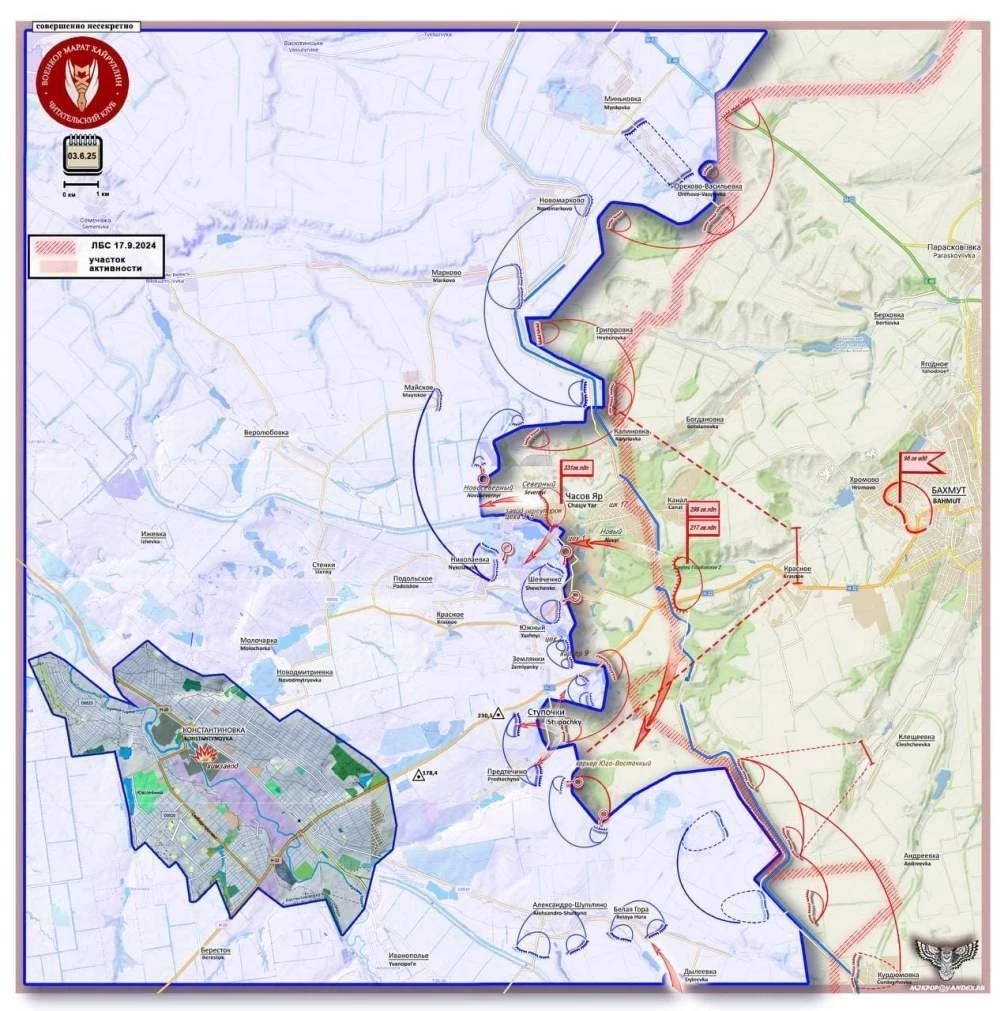 На Константиновском направлении южнее Часового Яра ВС РФ ведут штурмовые действия в Ступочках, продолжаются встречные бои. Под контроль российских войск перешел участок местности западнее Озаряновки между р. Балмутка и участком канала «Северский Донец-Донбасс». Также ВС РФ ведут штурмовые действия с опорой на Александрополь севернее в направлении Яблоневки.