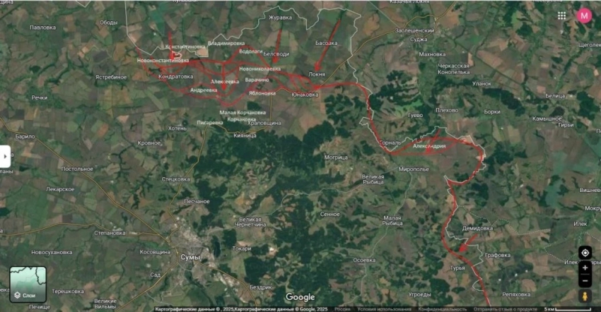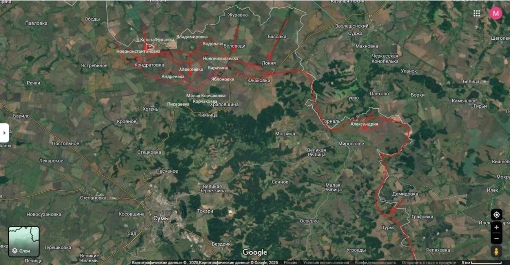 На Сумском направлении российские войска продолжают успешное наступление. После освобождения Яблуновки наши подразделения вышли к Малой Корчаковке, создавая угрозу окружения для украинских сил в Юнаковке.