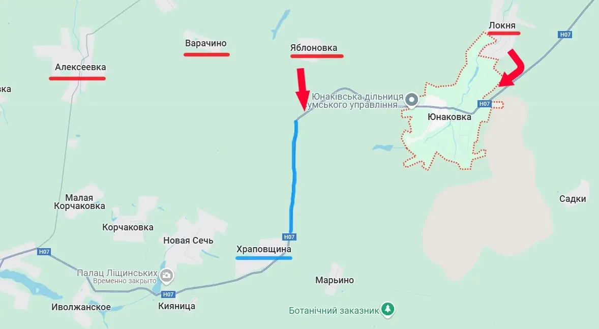 Таким образом, положение дел для противника в Юнаковке значительно ухудшилось. Подразделения ВСУ в этом селе оказались фактически в оперативных клещах – перерезаны оба участка автодороги Н-07 – как к востоку, так и к западу от села, которое во время курской авантюры противника выполняла функцию одного из основных транспортно-логистических узлов. Сейчас противник превратил Юнаковку в укрепрайон в расчёте на то, что так можно сдержать российское наступление в сторону Сум.