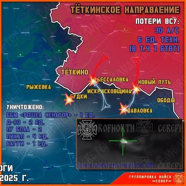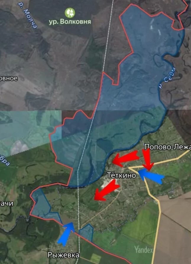 "Противник продолжает попытки прорваться к нашим позициям. Враг пытается от Рыжёвки через кладбище и у очистных зайти малыми группами по 5 человек. Мы укрепили рубежи, ВДВ, морпехи, мотострелки провели ротацию, подвезли резервы, бьёмся за Тёткино".