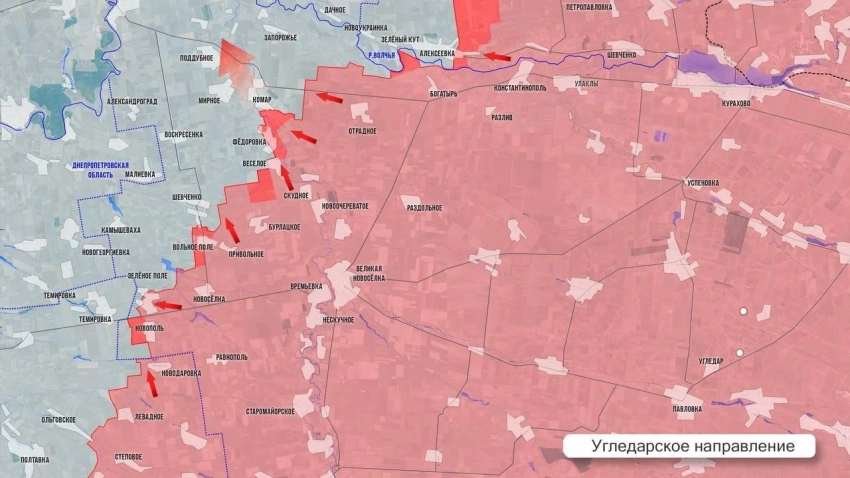 На Угледарском направлении основные бои идут в районе Комара, где ВС РФ вышли к центру села. На северном берегу Волчьей наши зачищают территорию севернее Алексеевки и активно продавливают оборону ВСУ в сторону Зелёного Кута и Новоукраинки. С мест сообщают, что ВС РФ вышли к границам Днепропетровской области в районе Новоукраинки.