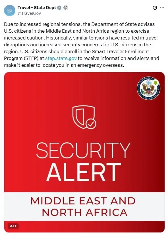 Госдеп США опубликовал срочное обращение к своим гражданам на Ближнем Востоке и в северной Африке в связи с возможной войной Израиля и Ирана