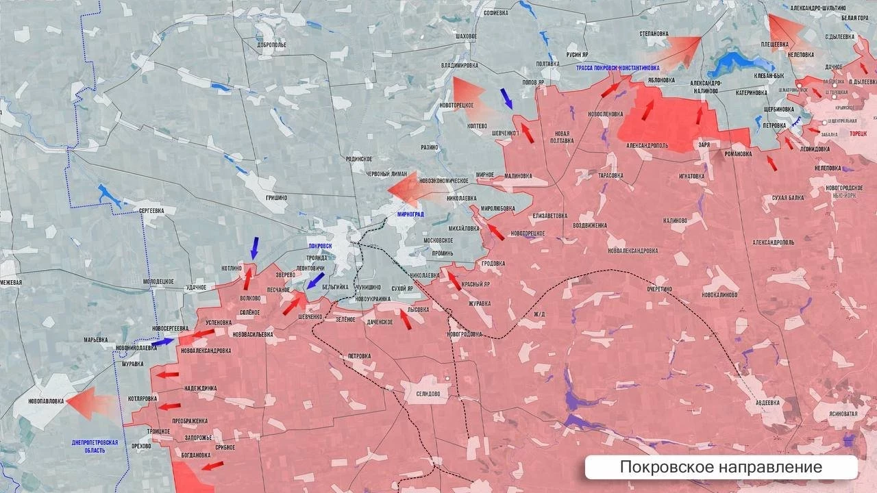 На Покровском направлении армия России на 1,5 км расширила контроль в районе Котляровки, наступает на Муравку. Севернее Новосергеевки уничтожен вражеский укрепрайон, а западнее Удачного наши бойцы стремятся выйти на границу Днепропетровской обл. В попытках остановить наступление ВС РФ, командование ВСУ укрепляет оборону в Новопавловке, куда ВСУ выходят из освобождённых нашими деревень. Вероятно, армия России усилит давление на противника в районе Орехово - Балка Ореховая - Филия для охвата Новопавловки с севера.
