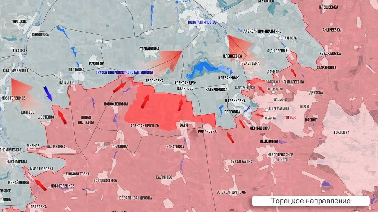К западу от Торецка у наших сил есть тактические успехи южнее Яблоновки. Российские подразделения пробиваются в районе Александро-Калиново, а также севернее Романовки. Севернее Торецка наши закрепились на окраине террикона, а также в лесах южнее Дылеевки, сообщает Олег Царёв в своём Telegram-канале.