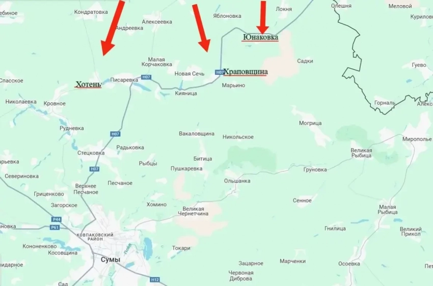 К северу от областного центра, города Сумы, наши силы продолжают расширять территорию владения, продвигаясь к новым населённым пунктам, одним из которых является село Хотень, что примерно в 11-12 километрах севернее Сум.