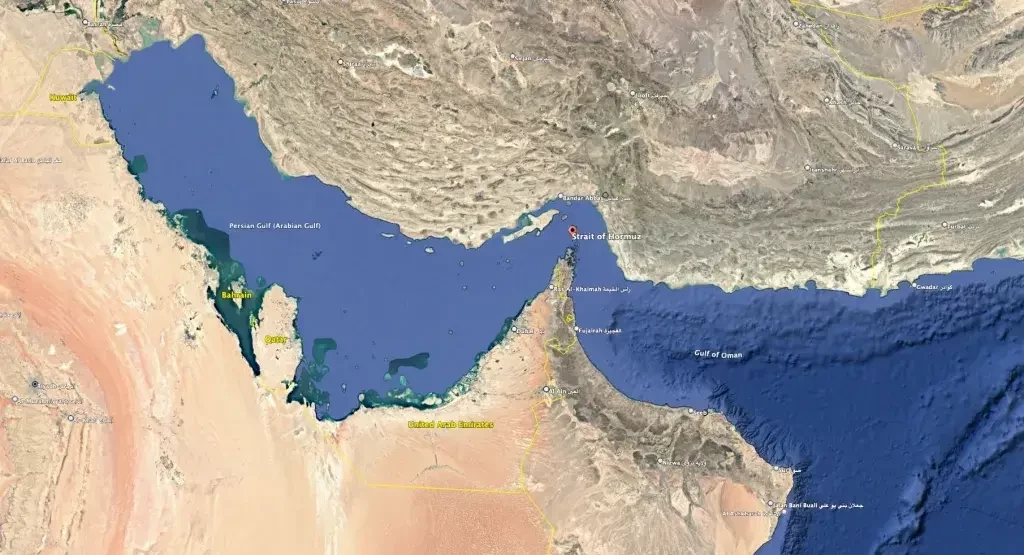 Спутниковый снимок, показывающий общее расположение Ормузского пролива и подчёркивающий его стратегическое значение