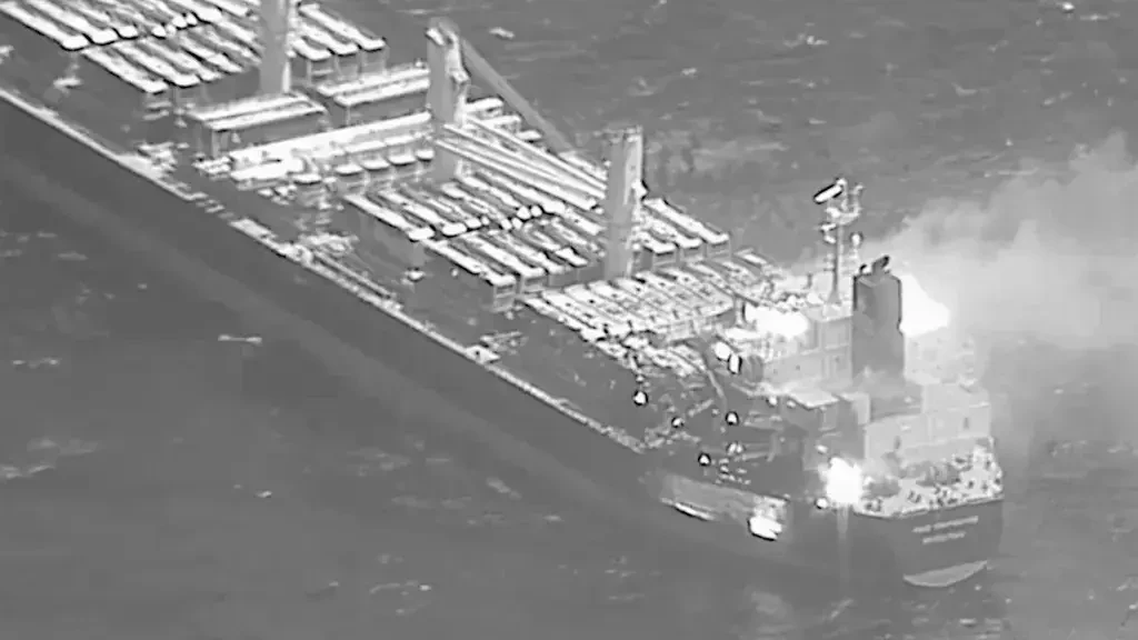 Грузовое судно True Confidence под флагом Барбадоса загорелось после попадания в него ракет хуситов в прошлом году. Снимок с дрона ВМС США