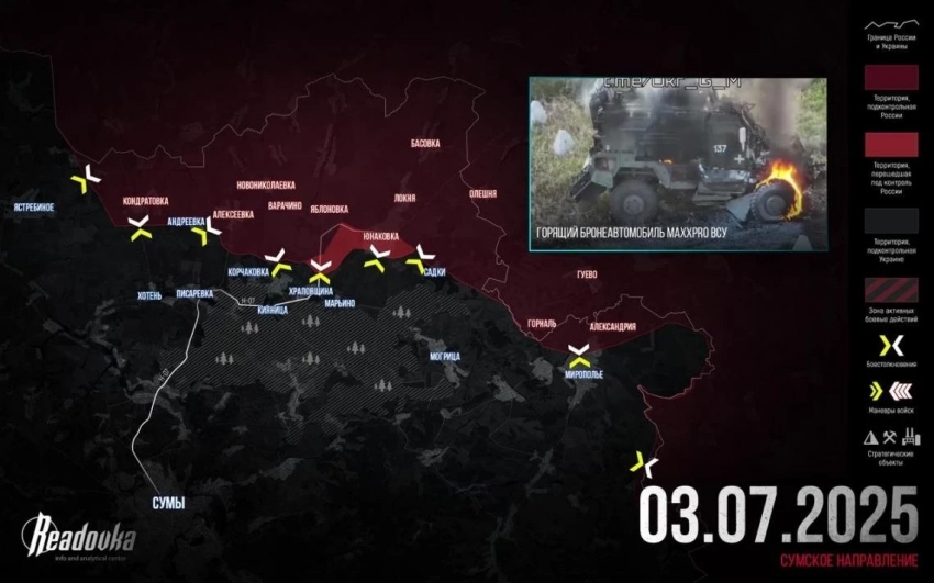 На Сумском направлении ВС РФ уничтожили штурмовую группу из Бессаловки и расширили подконтрольную территорию в районе Тёткино. В районе Юнаковки и соседних сёл противник контратаковал более 10 раз, идут встречные бои.
