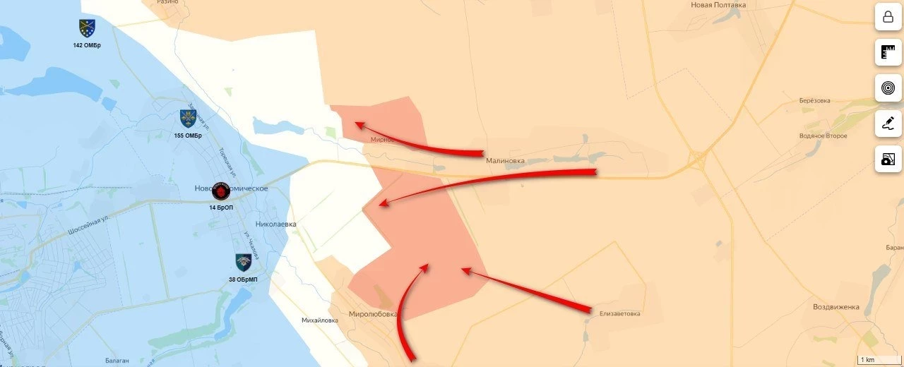 На Запорожском участке ВС РФ фактически зачистили северо-западную часть Каменского. Отдельные группы штурмовиков заходят в Плавни, но закрепления там пока нет. Севернее Лобкового и к северо-востоку от Степового наши бойцы выбили противника из опорников и продвинулись по лесополосам. Ожесточённые бои в районе Малых Щербаков. Продолжаются бои в Малой Токмачке.