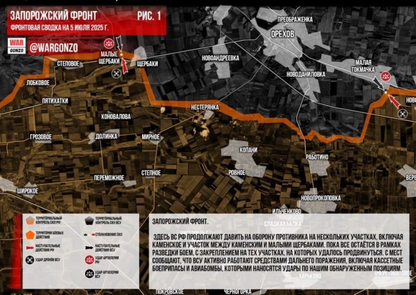 На Запорожском направлении ВС РФ продолжают давить на оборону противника на нескольких участках, включая Каменское и участок между Каменским и Малыми Щербаками. Пока все остаётся в рамках разведки боем, с закреплением на тех участках, на которых удалось продвинуться. С мест сообщают, что ВСУ активно работают средствами дальнего поражения, включая кассетные боеприпасы и авиабомбы, которыми наносятся удары по нашим обнаруженным позициям, отмечает Telegram-канал Wargonzo.