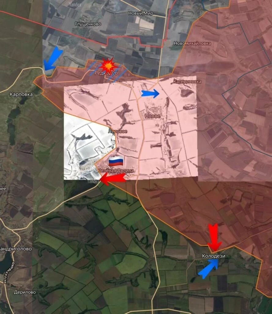 На Константиновском направлении российские войска расширили контроль территории севернее Торецка, ведут штурмовые действия в Щербиновке и Яблоневке, сообщает Telegram-канал "БелВПО".