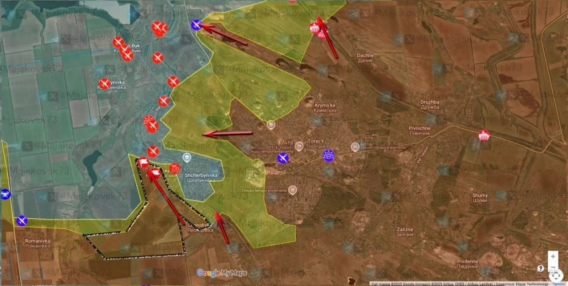 На Покровском направлении российские войска давят в районе Новоторецкого, Фёдоровки и западнее Разино, расширили контроль территории западнее Елизаветовки.