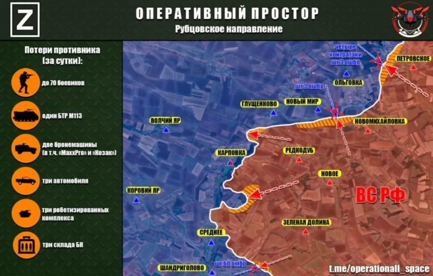 В Сумском приграничье не стихают бои в Кондратовке: ВСУ продвигаются на западе от села и пытаются вытеснить наших к его южным окраинам. Российские войска продолжают пробиваться по дороге на Храповщину между Варачино и Юнаковкой. В самой Юнаковке идут упорные бои на юго-западной окраине. Расширен плацдарм в районе Поповка-Демидовка, у Марьино.