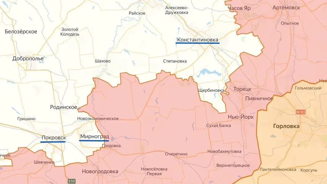 Подразделения ВС России широким фронтом вклиниваются между Красноармейском (украинское название – Покровск) и Константиновкой. Они обходят оборону покровской группировки ВСУ с востока и северо-востока, создавая полукольцо, охватывающее Красноармейск и Димитров (переименован киевским режимом в Мирноград). Этот участок фронта считается одним из наиболее важных ы зоне проведения спецоперации.