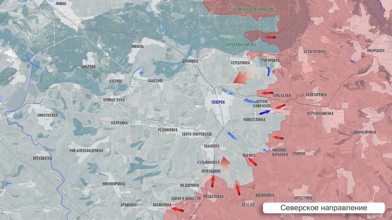 На Северском направлении ВС РФ предприняли попытку прорваться к Северску на бронетехнике, но не стали форсировать штурм, чтобы обойтись без больших потерь. Тяжёлые бои южнее Серебрянки, сообщает в Telegram-канале Олег Царёв.