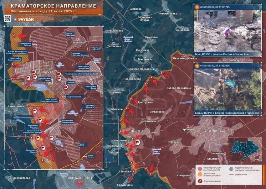 На Константиновском направлении упорные бои в районе Александро-Калиново, начинается штурм юго-западной окраины Катериновки. В Щербиновке ВС РФ стараются взломать оборонительные рубежи ВСУ. Севернее Торецка продолжаются бои в районе Александро-Шультиино. Главная новость дня на этом участке - официальное заявление МО РФ об освобождении Часов Яра. Тяжелейшее сражение за этот, в сущности, небольшой, но расположенный в очень сложных ландшафтных условиях город, длилось 16 месяцев. За противником остаются позиции в Червоном, Николаевке, откуда противник наверняка будет контратаковать. Тем не менее, освобождение города - важнейший шаг к охвату с востока Константиновки и Дружковки.