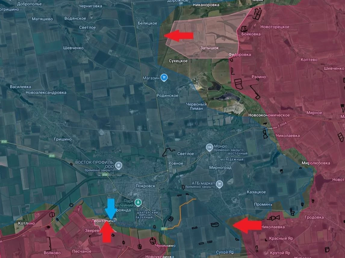 Сообщения о боях в Леонтовичах, Новоукраинке и Лысовке указывают на попытки ВСУ стабилизировать оборону. На восточном фланге российские войска прорывают рубежи к северу от города, с неподтверждёнными данными о боях на окраинах Сухецкого.