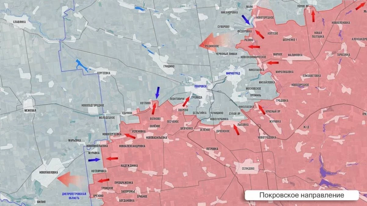 На западном участке Покровского направления армия России атакует вдоль лесополос в направлении границы с Днепропетровской обл. На юге от Покровска российская пехота, несмотря на ожесточённое сопротивление ВСУ, продвинулась далеко за Троянду и ведёт бои в районе Шахтёрского, чтобы выровнять линию фронта и выйти на железнодорожную ветку. Противник отступает из соседнего Чунишино. Вооружённые силы России отрезали восточный путь снабжения Покровска, продвигаясь в районе Миролюбовки. Наступая в районе Сухецкого, что на севере от Родинского, наши войска лишили противника и важнейшего северного маршрута снабжения Покровска. При этом потеря самого Родинского ускорит обрушение всего северного участка обороны Красноармейской агломерации.